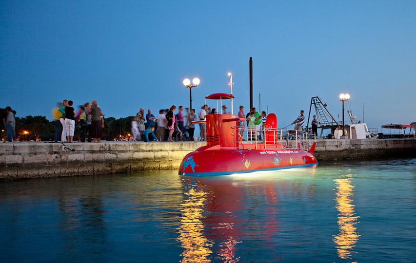 Since the begining of time the underwater world and the depth of the ocean has fascinated mankind. With the semi submarine Rovinj we have made imagination closer to reality. The semi submarine is a new attraction which is prominent in the blueness of the Rovinj sea. It looks like a real submarine and with its red colour it attracts many curious onlookers.